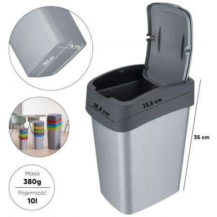 Ведро для мусора с крышкой Swing bin, объемом 50 литров, изготовлено из материалов, проверенных на прочность и которые отличаются долговечностью использования. Когда речь идет о решениях, примененных в контейнерах для мусора Swing bin, следует обратить внимание на удобную откидную крышку, которая значительно упрощает утилизацию мусора. Еще один интересный элемент - широкая полоска, закрывающая мешок для мусора, чтобы он не был виден.