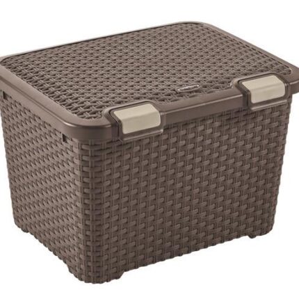 Ящик выполнен из высококачественного пропилена, текстура поверхности напоминает ротанговое плетение. Контейнер закрывается крышкой на шарнирах, предотвращая попадание пыли. Благодаря своей текстуре внутри ящика происходит постоянная циркуляция воздуха. В случае необходимости контейнер легко мыть