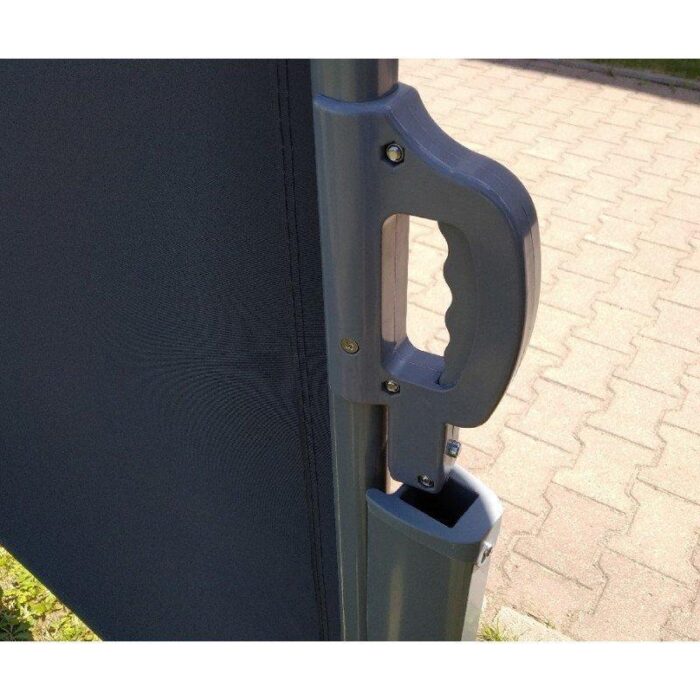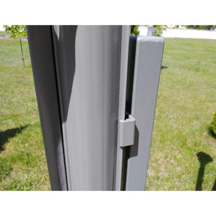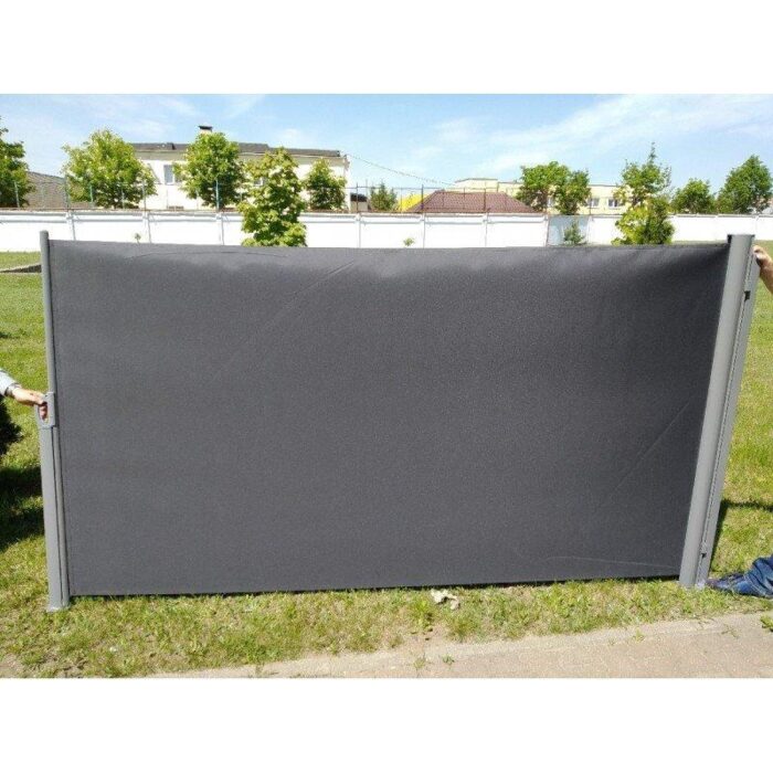 Цвет ткани – серый. Высота боковой маркизы – 1,6 метра, ширина раскладывания – до 3 метров.