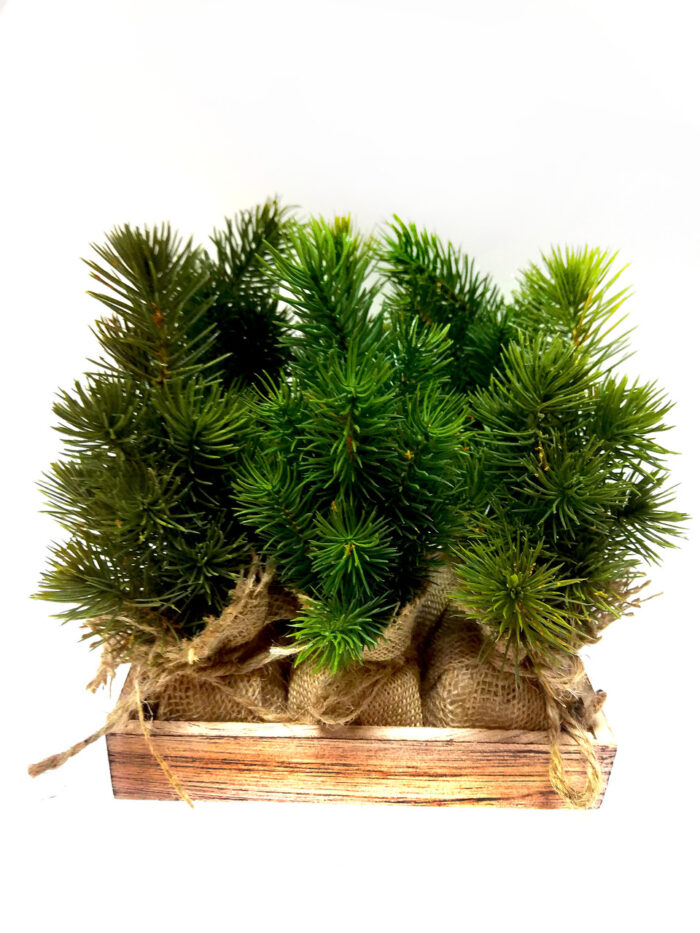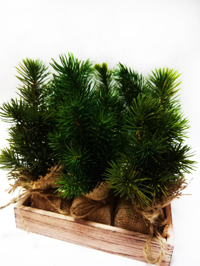 Искусственная елочка насыщенного зеленого цвета в холщовом мешочке. Елочки в деревянной подставке.