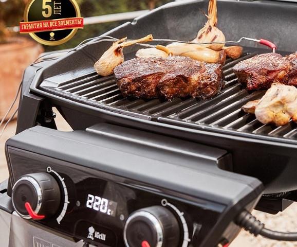Цифровой термометр IGrill входит в комплект и объединен с грилем для точного контроля процесса приготовления. Система IGrill включает специальный щуп и модуль Blutooth, благодаря которому и происходит передача данных о температуре в мобильное приложение на смартфон. Подробнее о работе системы IGrill можно ознакомиться тут.