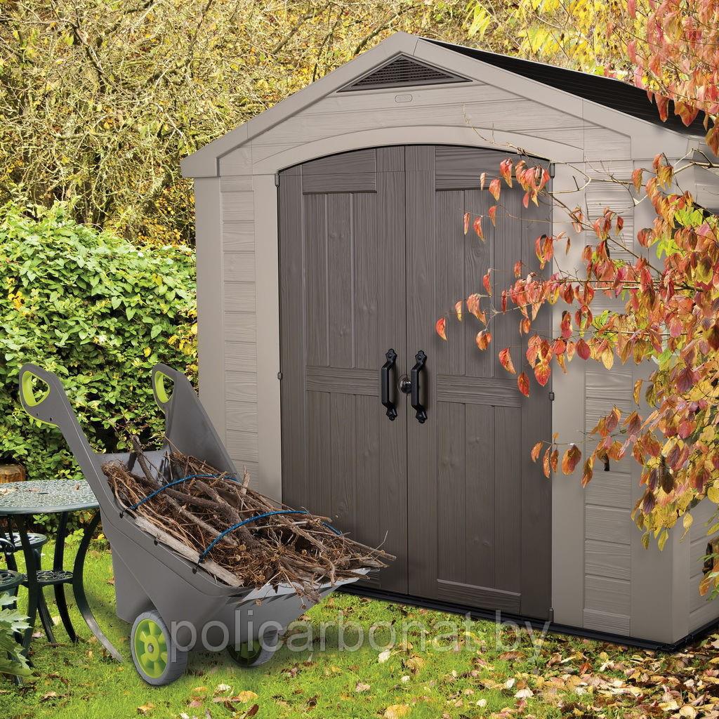 Исключительно просторный и оригинальный по своей природе домик для инструментов. Это ответ на потребности тех, кто ищет современные и очень функциональные решения для своего сада. Большая вместительность позволяет установить стеллажи и полки для инструментов, а также хранить крупногабаритное оборудование и садовые аксессуары. Двойные стенные панели, изготовленные по технологии DUOTECH™, отличаются высокой стойкостью против действия неблагоприятных погодных условий. Прочная крыша, дополнительно укрепленная стальной конструкцией, выдерживает до 200 кг/м² снега. Несомненным достоинством является возможность покраски домика в любой цвет на Ваш выбор.