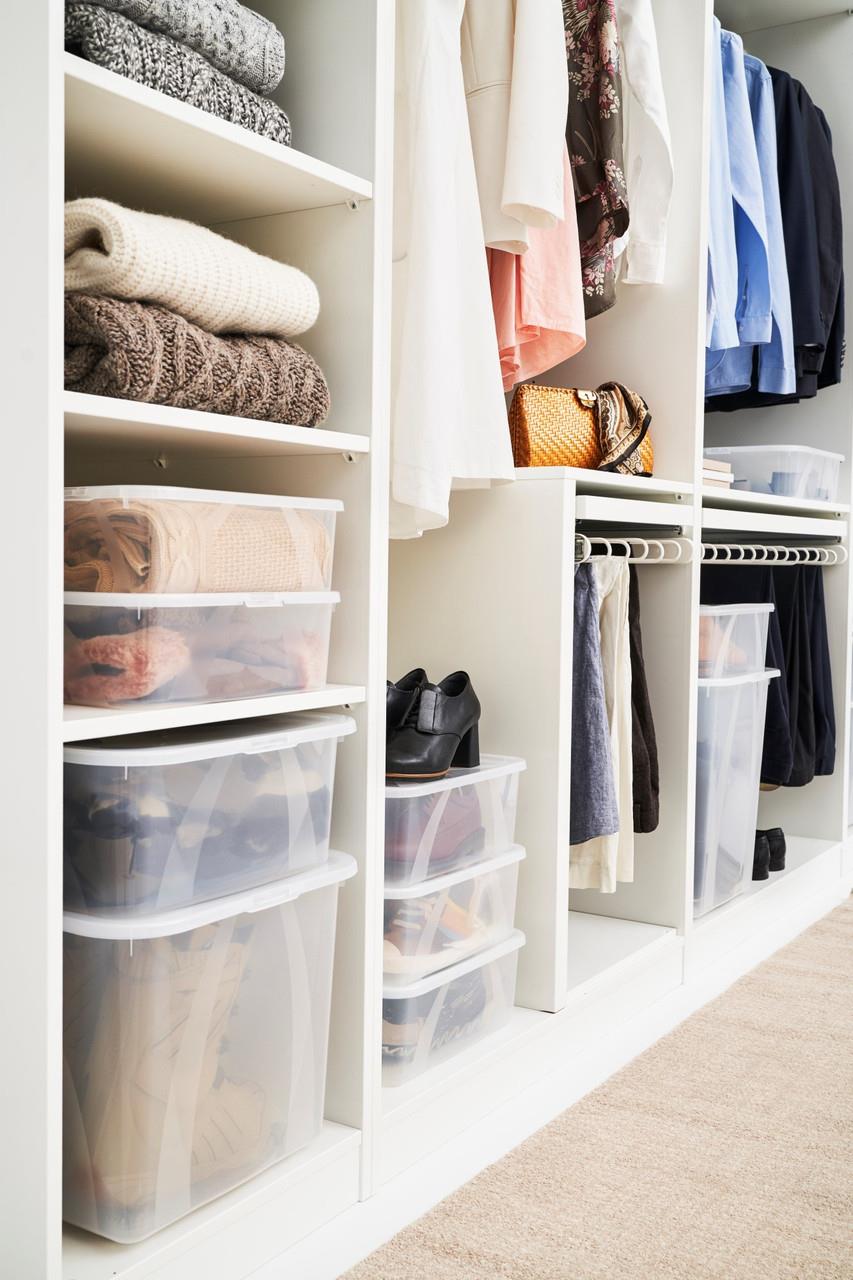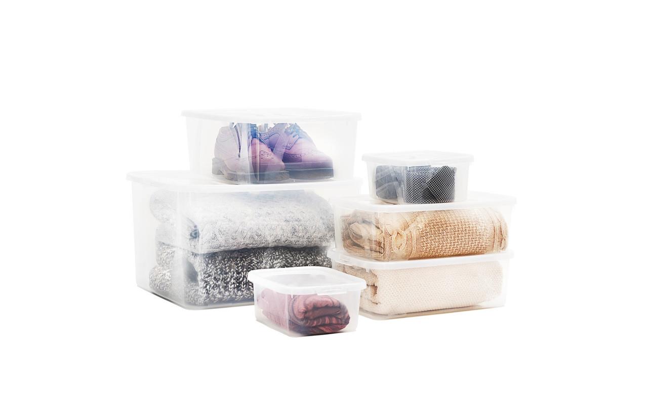 В прозрачную коробку собирается всё, что лежит вокруг, оставаясь в порядке, но в то же время все вещи легко найти в шкафу или комоде через полупрозрачную поверхность коробки.