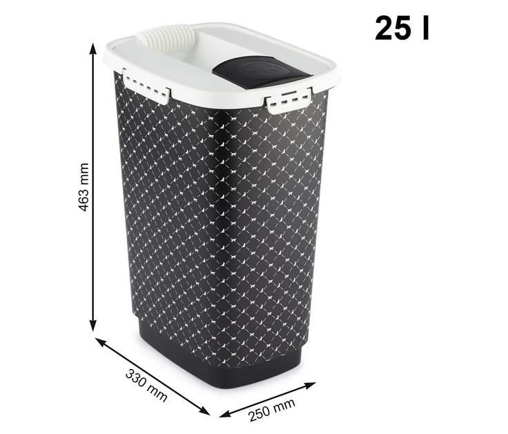 Контейнер для корма для домашних животных изготовлен из пищевого пластика и имеет объем 25 л.