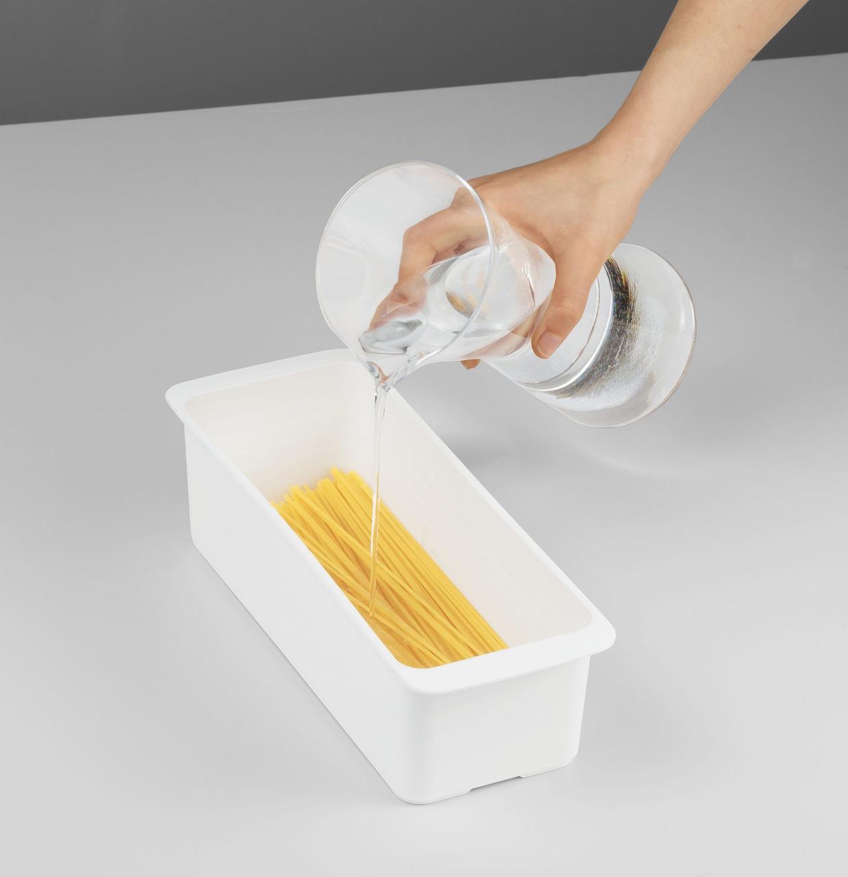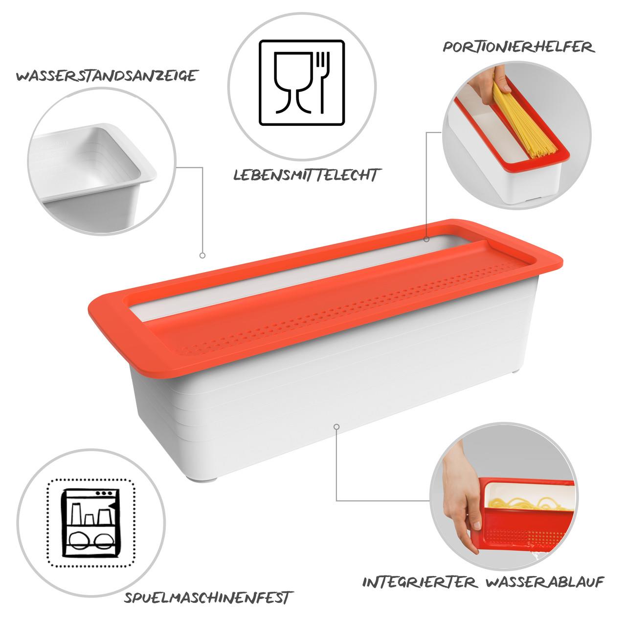Если Вы любите есть пасту в самых разных вариантах, вы наверняка знаете, насколько важно, чтобы спагетти, лапша или вемишель были правильно приготовлены. MEMORY MICROWAVE от Rotho готовит макароны так, как вам нравится. Для этого поместите лапшу в емкость и залейте ее водой до тех пор, пока она не будет покрыта водой. Затем поместите все это в микроволновую печь с крышкой, и через несколько минут лапша будет готова. Для этого ознакомьтесь с рекомендациями о времени приготовления для разных макаронных изделий. После слива воды вы можете подавать лапшу прямо на стол.
