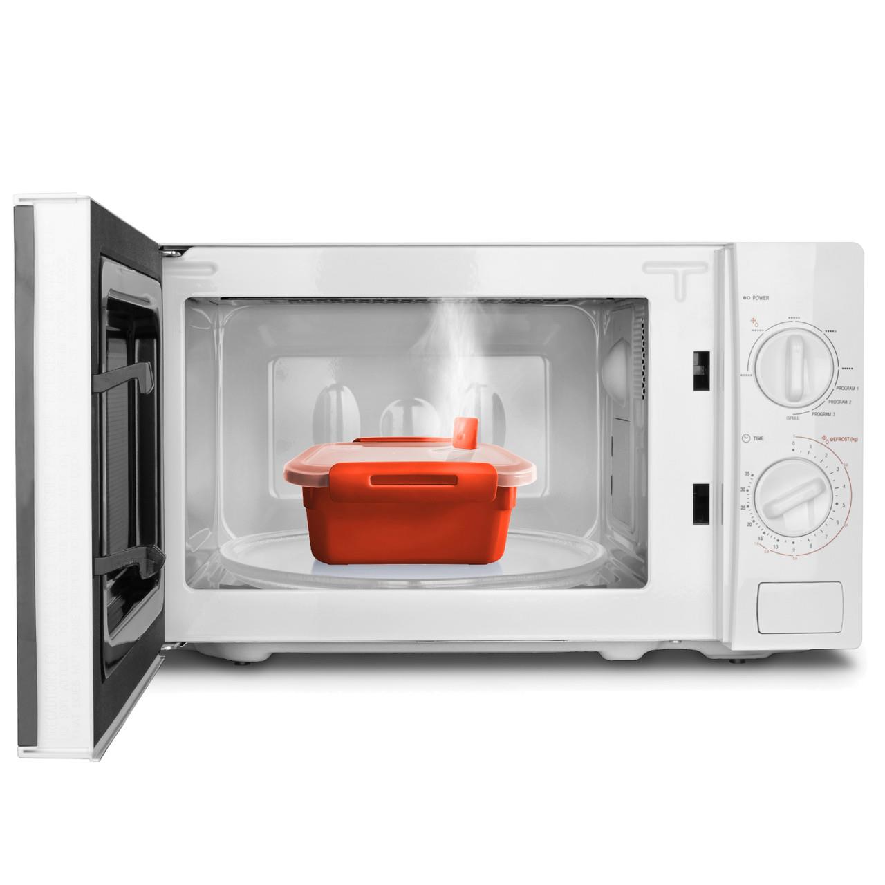 Водяной пар во время приготовления пищи выходит через паровой клапан в крышке, а распылители соуса надежно остаются в контейнере — чистить потом нечего. Даже чистку микроволновки можно удобно оставить в посудомоечной машине после использования, не испортив высококачественный пластик.