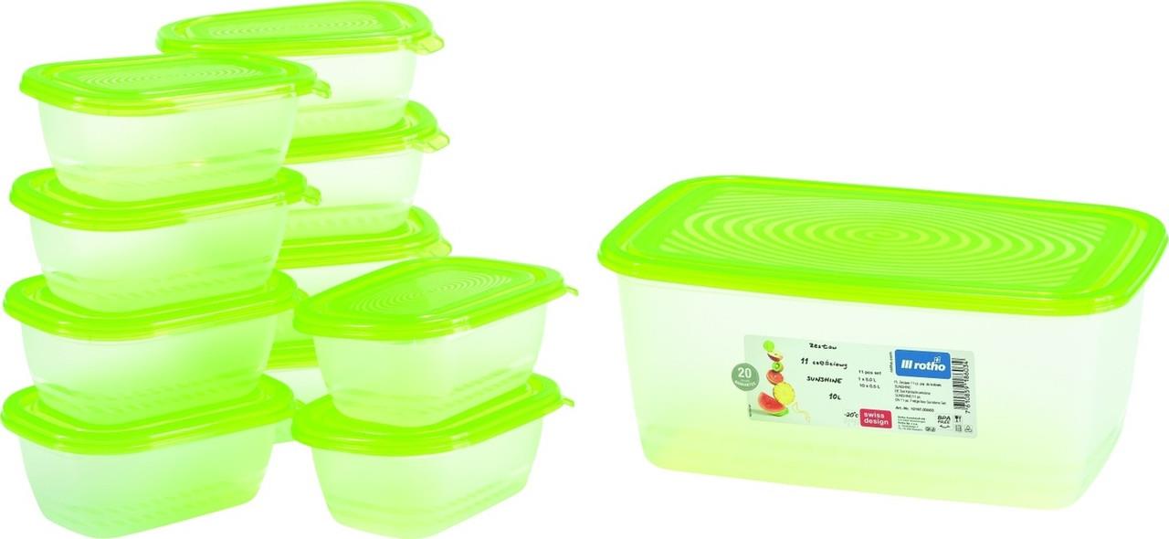 Набор контейнеров для продуктов Rotho SUNSHINE 10х0,5 л; 1х5 л выполнен из качественных надежных материалов, которые могут абсолютно безопасно взаимодействовать с пищей, и при этом не нанесут вреда здоровью человека. Подходят для заморозки продуктов при t -20 гр. Подходят для мытья в посудомоечной машине.