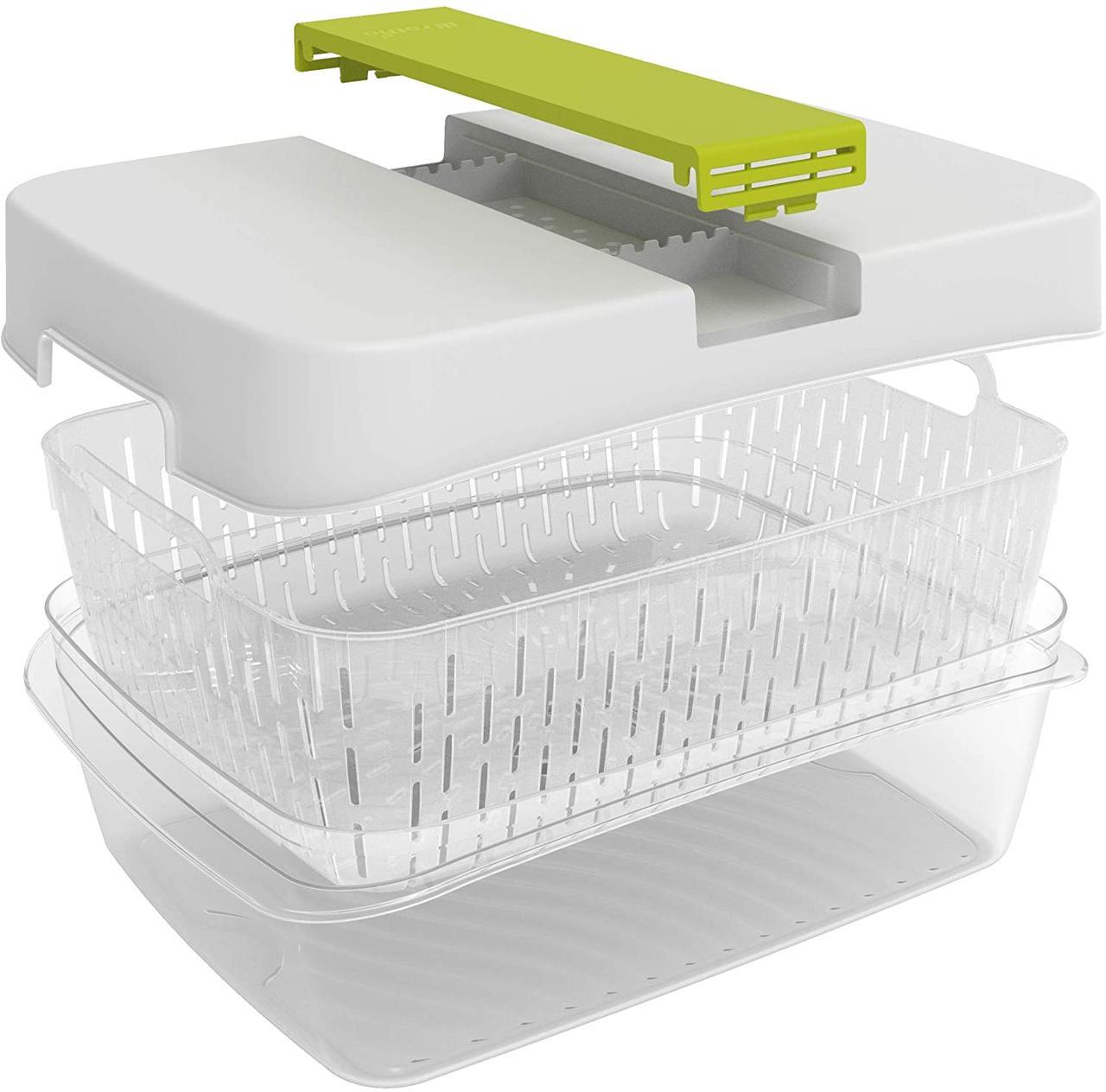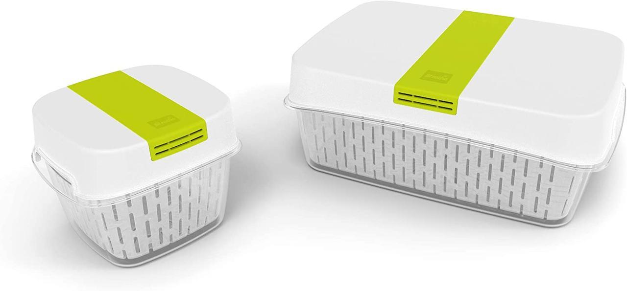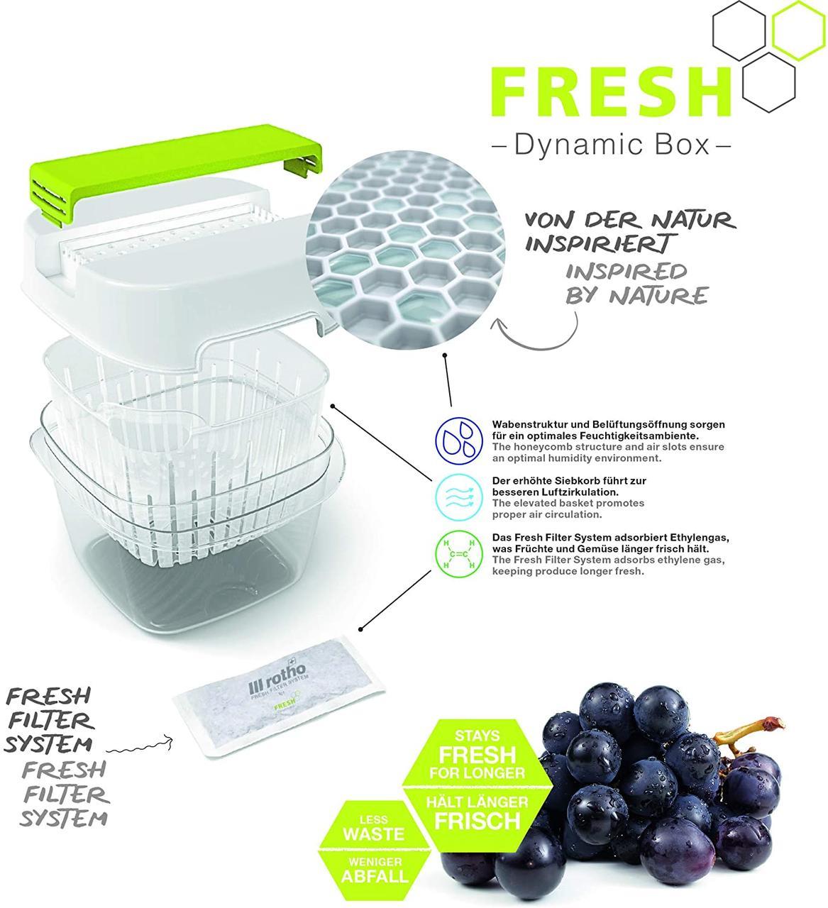 С Dynamic Box 1,6л FRESH ваши фрукты и овощи теперь сохраняются дольше. Кроме того, большим преимуществом является то, что вы также можете хранить свежую пищу здесь в больших количествах. Летом правильное хранение особенно важно, потому что позволяет хранить продукты более одного или двух дней. Сбалансированную влагу обеспечивают система вентиляции. Корзина экрана установлена увеличенная так, что циркуляция воздуха будет работать оптимально. В комплект поставки входит свежий фильтр. Наборы свежих фильтров приобретаются отдельно в магазине. С Динамик Фреш Бокс вы сэкономите деньги, так как и овощи и фрукты сохраняются дольше. PP- пластик, из которого изготовлен контейнер Fresh Box, не содержит BPA и загрязняющих веществ. Для очистки поместите детали в посудомоечную машину.