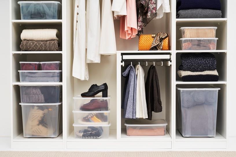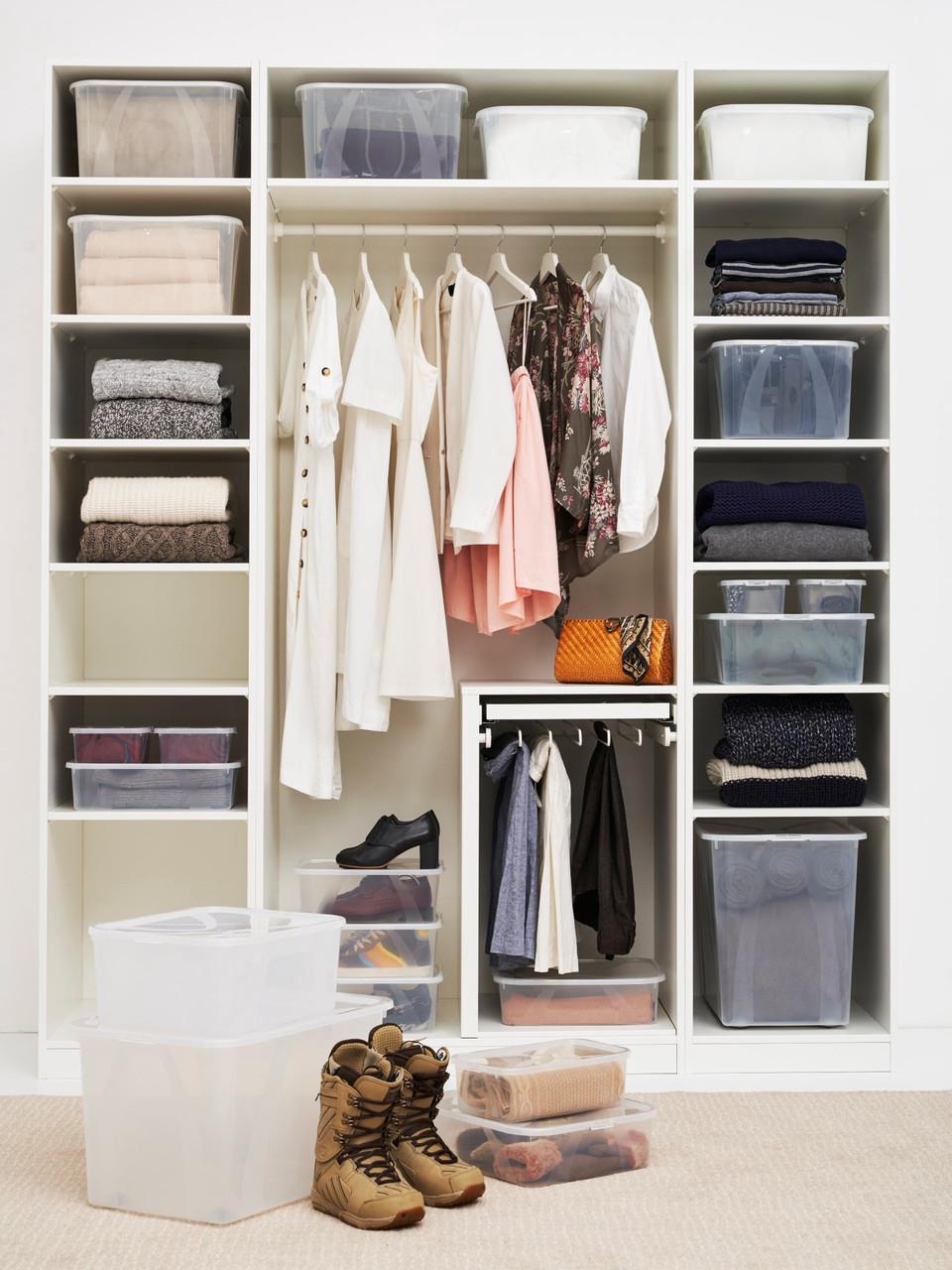 В прозрачную коробку собирается всё, что лежит вокруг, оставаясь в порядке, но в то же время все вещи легко найти в шкафу или комоде через полупрозрачную поверхность коробки.