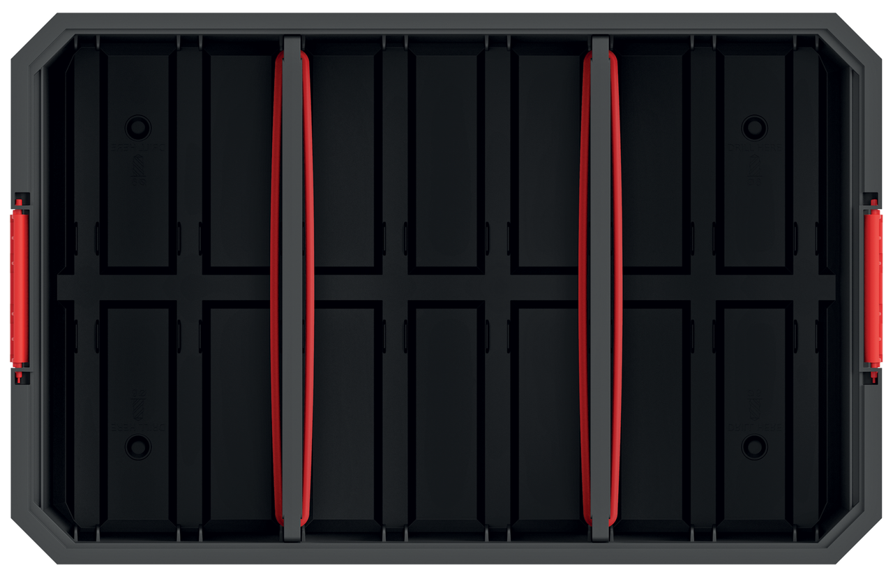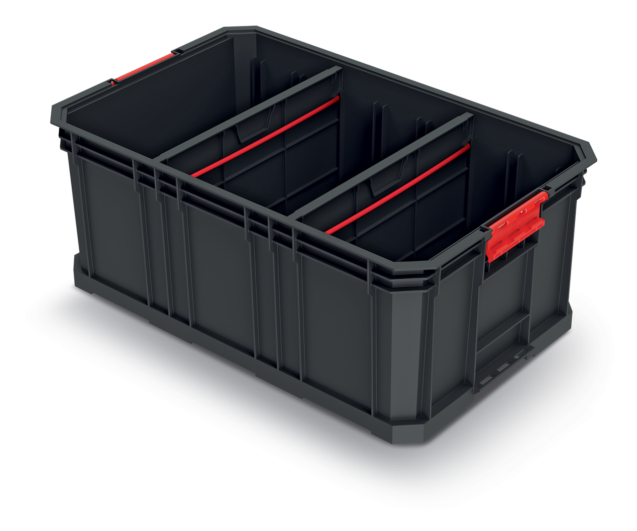 Контейнер для мастерских повышенной вместимости и глубины. Продукт оснащен двумя съемными перегородками и встроенными разъемами с металлическими штырями, которые позволяют сцеплять их с другими элементами.