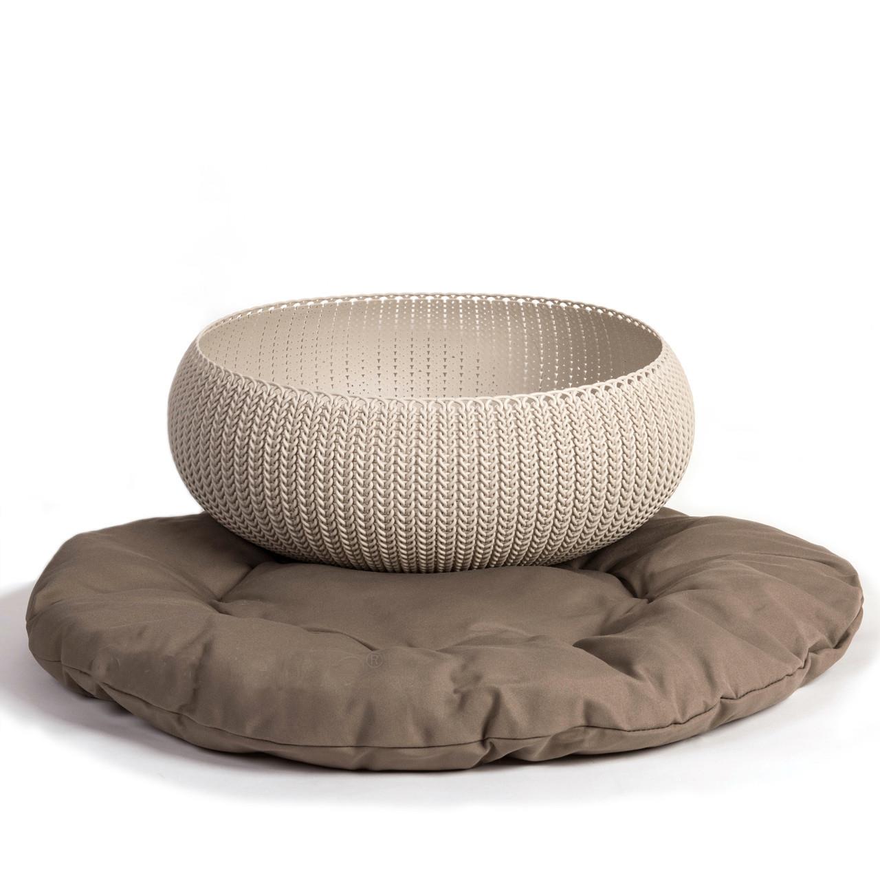 Удобная корзинка для вашего домашнего питомца с мягкой внутренней подушкой. Кошка или небольшая собачка оценит такую кроватку и отнесется с благодарностью к хозяину. Лежанка имеет текстуру будто связанную крючком, цвет классический и элегантный, поэтому корзинка будет  красиво выглядеть в любом интерьере, не нарушая общего вида. Лежанка очень быстро станет любимым местом вашего любимца. Подушку можно стирать. Высота лежанки 20 см.