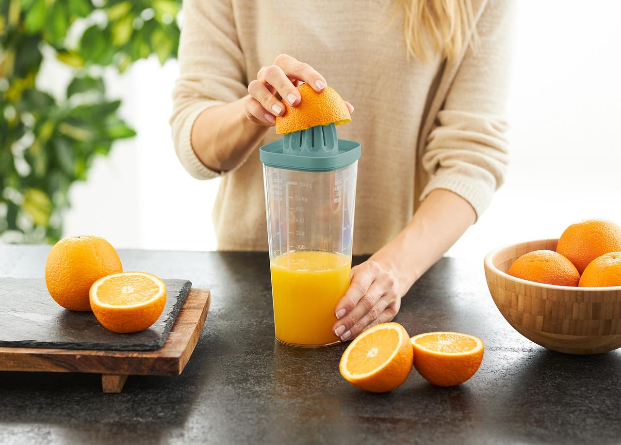 Благодаря прессу для цитрусовых вкусные фруктовые соки можно приготовить прямо в чашке. С насадкой-миксером жидкости можно взбить до кремообразной консистенции.