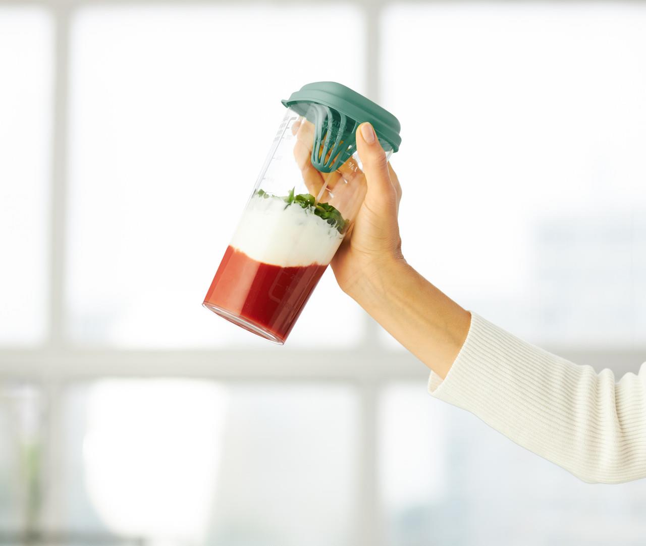 Кухонный прибор идеального размера для смешивания непосредственно в шейкере с помощью ручного блендера. В то же время он идеально помещается в боковой отсек холодильника, чтобы соусы, соки и многое другое оставались прохладными и безопасными.