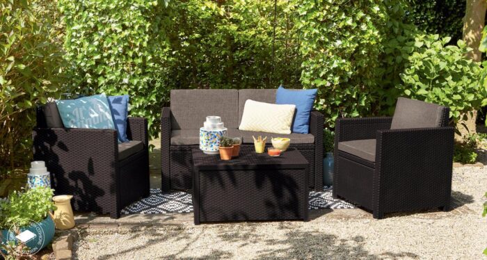 Monaco – это комфортный и элегантный набор мебели, который включает в себя: два кресла, софу и прямоугольный столик-тумбу. Оригинальная ротанговая структура поверхности и удобные сидения кресел и софы – это основные преимущества этой мебели. Прочный материал гарантирует стойкость к воздействию неблагоприятных погодных условий и УФ-излучения.