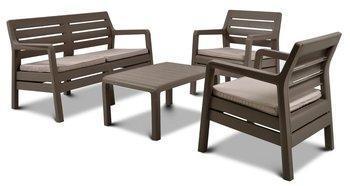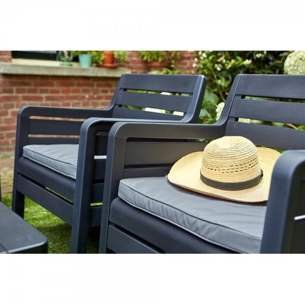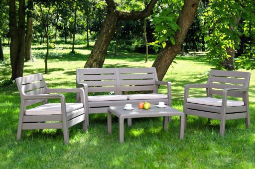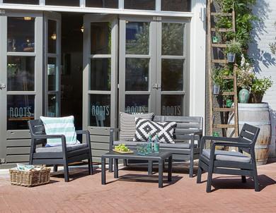 Delano – набор мебели с фактурой, напоминающей деревянные панели. В состав гарнитура входят софа, два кресла с подлокотниками и прямоугольный столик. Идеально подходит для использования на домашних балконах, террасах или в саду. Легко собирается и чистится.