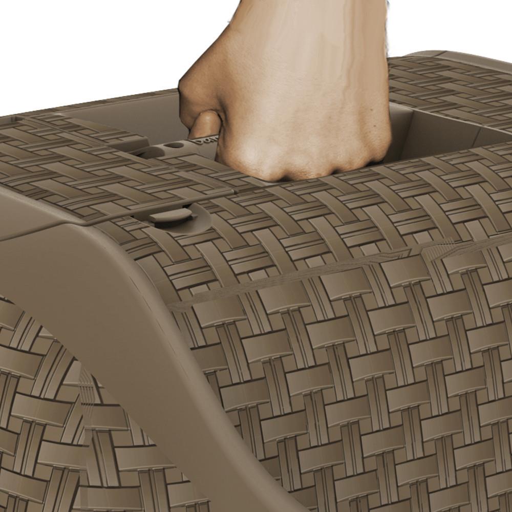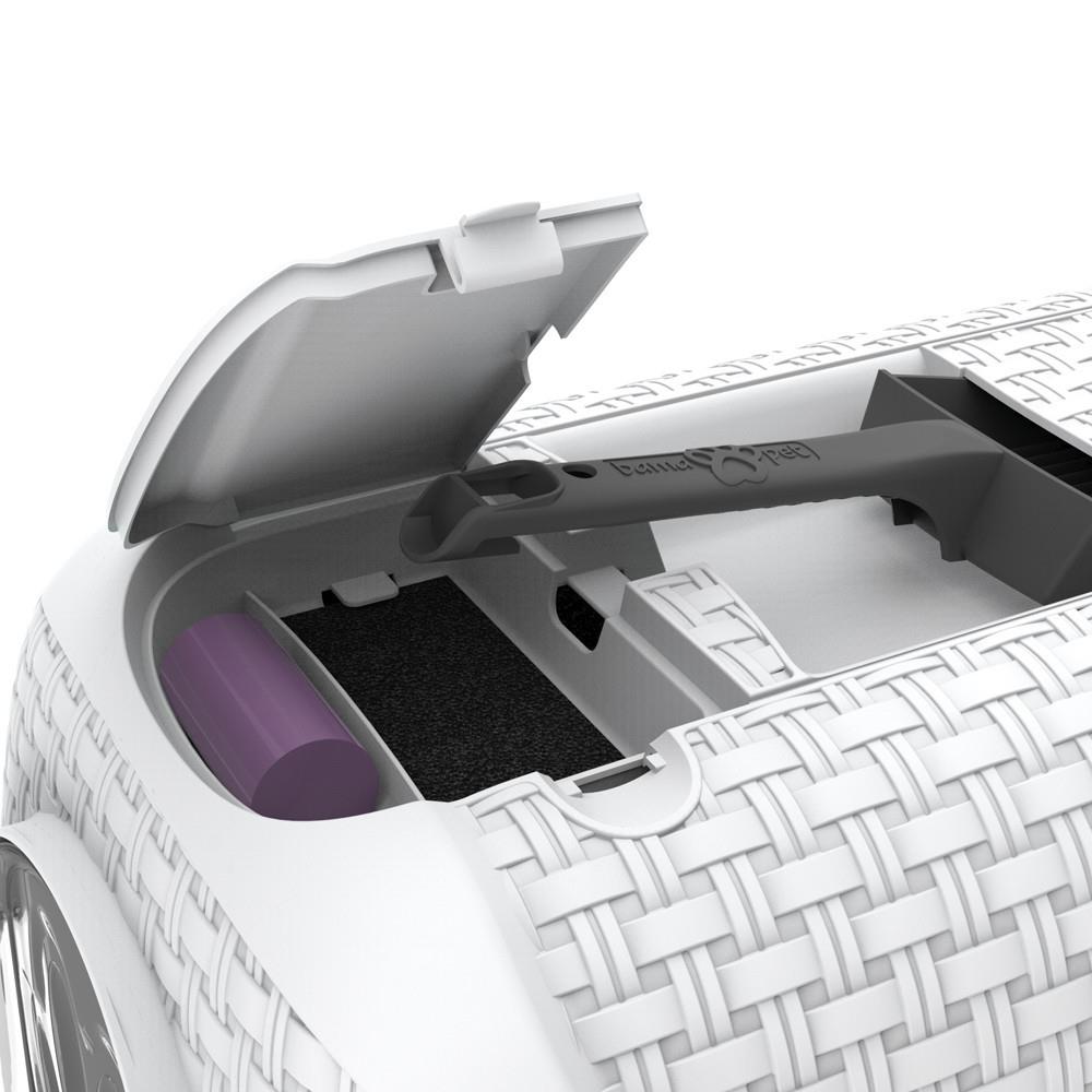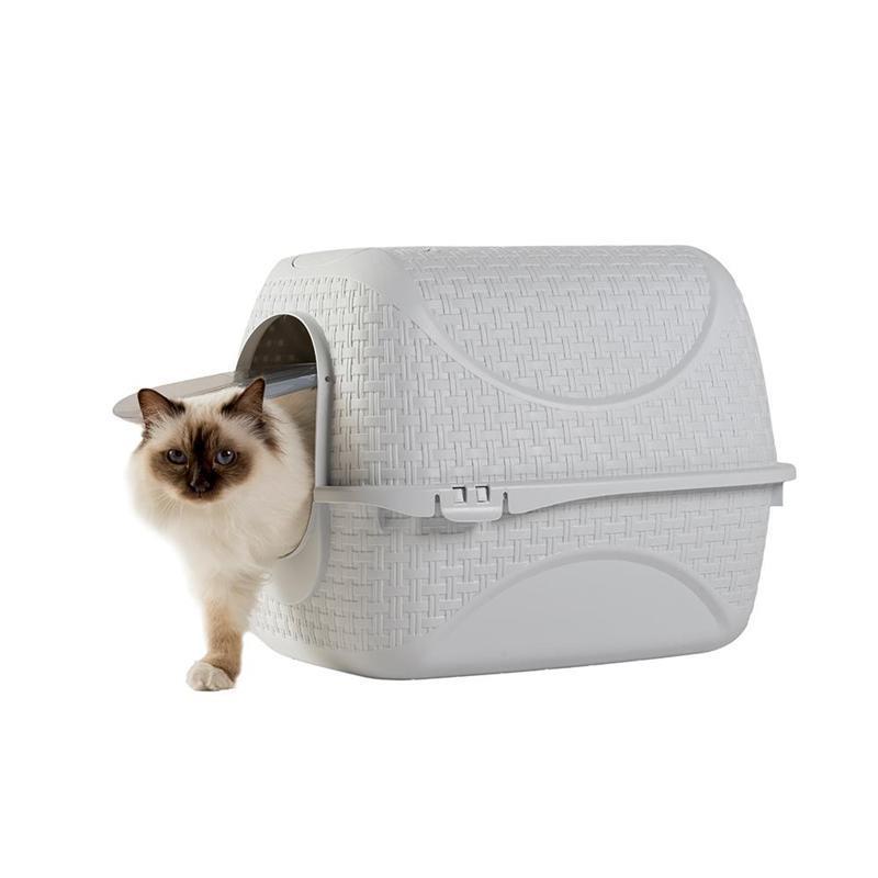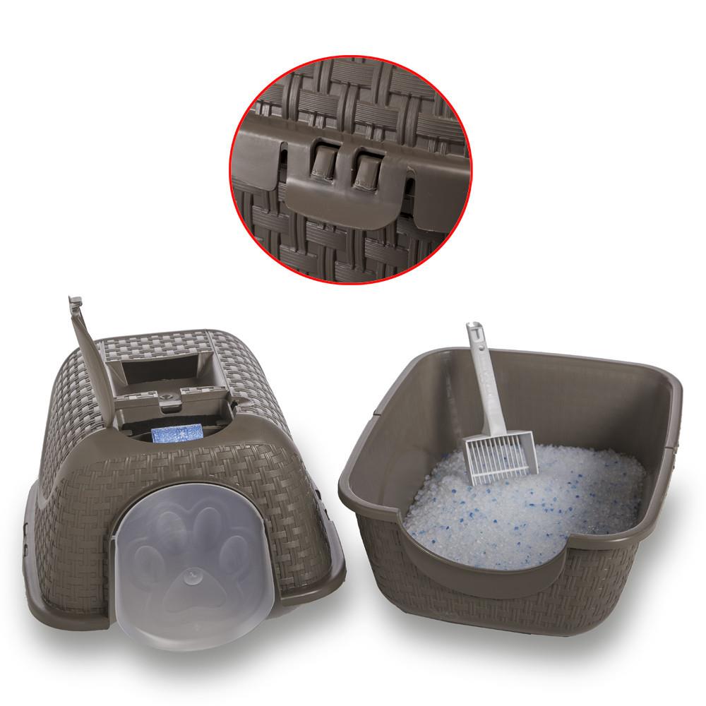Незаметный элегантный домик-туалет для питомцев имеет интересный дизайн под ротанг, гаражную дверцу и элегантный незаметный вид. Легкая сборка позволяет одним щелчком без труда очистить контейнер по необходимости. Туалет снабжен отсеком для совка и угольным фильтром для поглощения неприятных запахов. При закрытии отсека совок для наполнителя выполняет функцию ручки при транспортировке.
