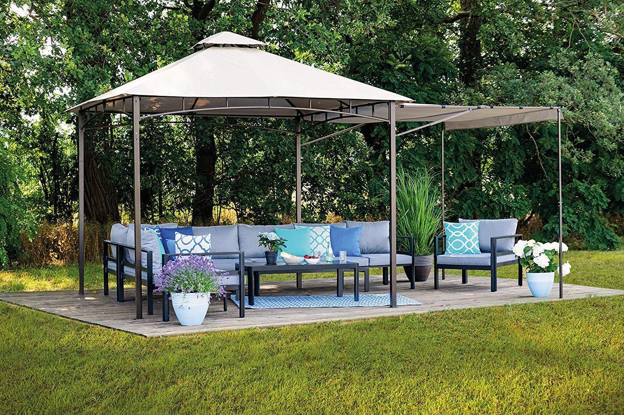 Садовый шатер с навесом – отличное решение быть на свежем воздухе и в то же время иметь крышу над головой, особенно в жаркие солнечные дни. Красивый шатер можно использовать для мероприятий и праздников на свежем воздухе, для летних вечеринок и семейных встреч на даче. Конструкция прочная с водоотталкивающим PA-покрытием. Боковая часть может быть как навесом, так и использоваться в качестве боковой стенки, если необходимо укрыть часть беседки от посторонних глаз. В ножках предусмотрены отверстия для колышков.