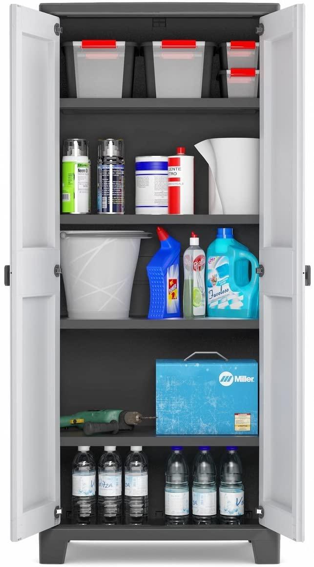 Универсальный двухдверный шкаф с полками для хранения инструментов и других предметов быта.