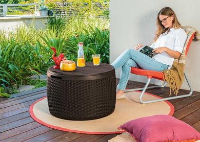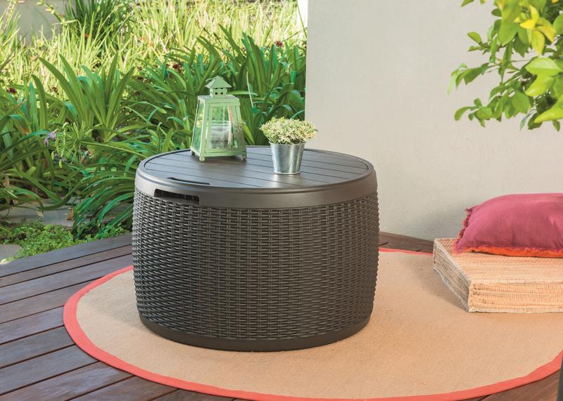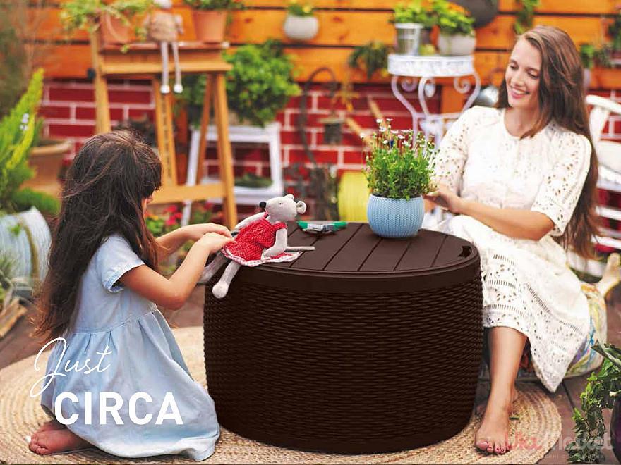 Круглый столик с функцией сундука станет универсальным и эксклюзивным решением для сада, веранды или террасы. Столик не только будет хранить аксессуары и мелочи, которые нужны под рукой, но также послужит кофейным столиком. Текстура поверхности, напоминающая ротанговое переплетение, создаст натуральное ощущение и подчеркнет красоту окружающего интерьера. Столик выполнен из полипропилена, устойчивого к влаге и другим неблагоприятным природным условиям. Отлично смотрится столик Circa Rattan Box также на балконах, террасах и в доме. Легкая сборка, не требует ухода.