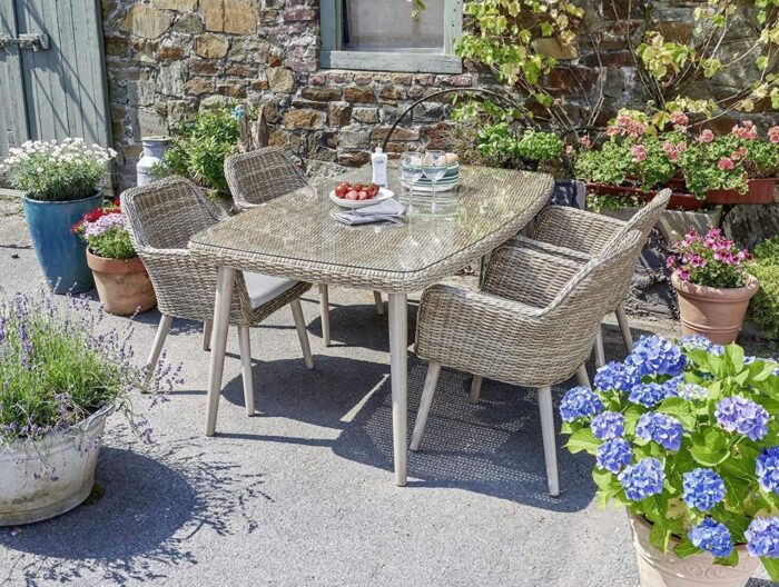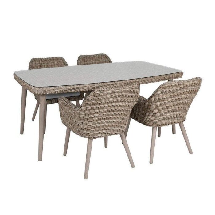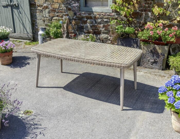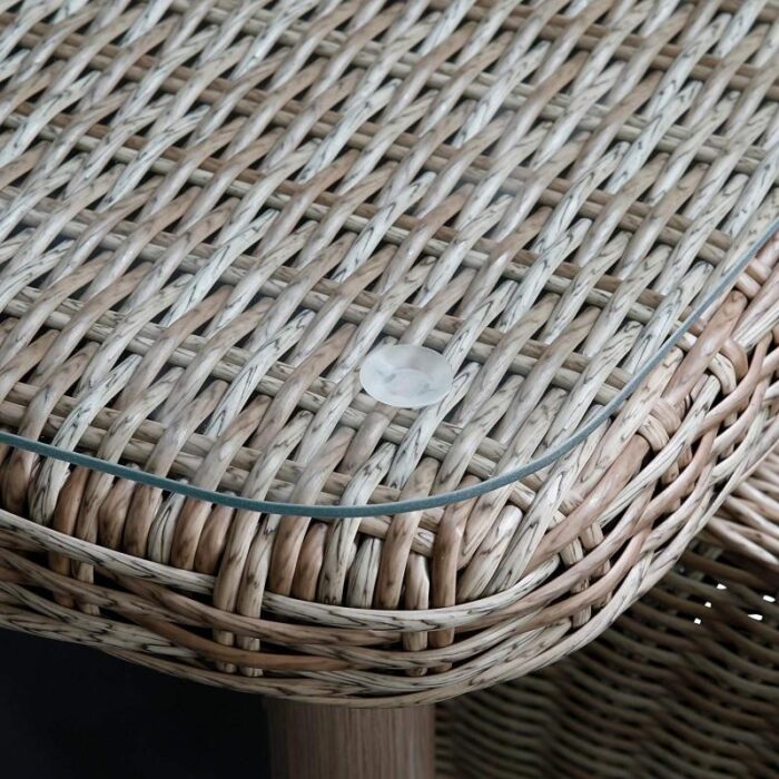 Стол выполнен из двухцветного полиротанга и алюминиевого каркаса с полимерным покрытием. Столешница покрыта прозрачным стеклом толщиной 5 мм.