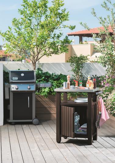 Unity Storage оснащен столешницей из нержавеющей стали, удобной ручкой с дополнительными вешалками и колесиками, благодаря которым продукт удобно перемещать в разные места. Во вместительный шкафчик можно положить подручные аксессуары, необходимые для приготовления и подачи блюд на свежем воздухе.