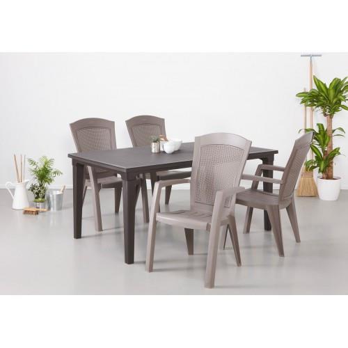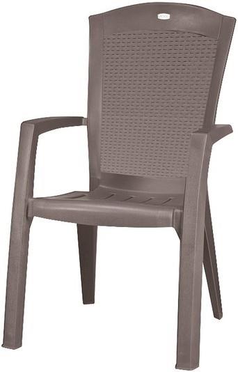 Спинка эргономичной формы, слегка расширяющейся вверху, имеет вставку, напоминающую ротанговое переплетение. Стул легко чистится и не требует особо ухода. Благодаря свойствам полипропилена стул устойчив к неблагоприятным погодным условиям и УФ-лучам, а также мало весит.