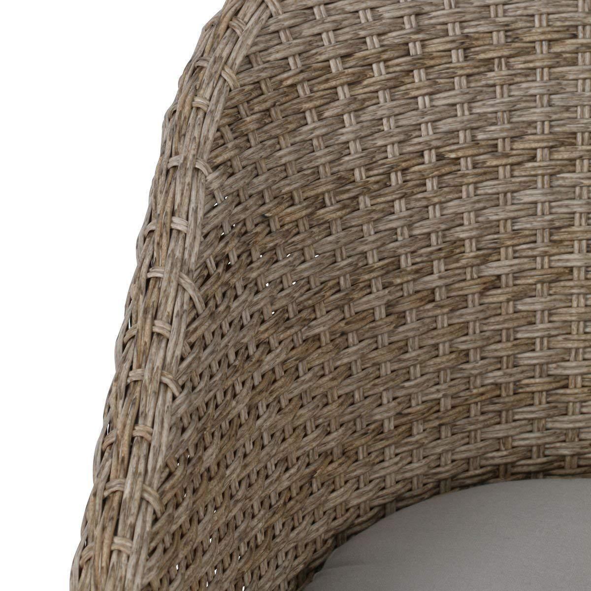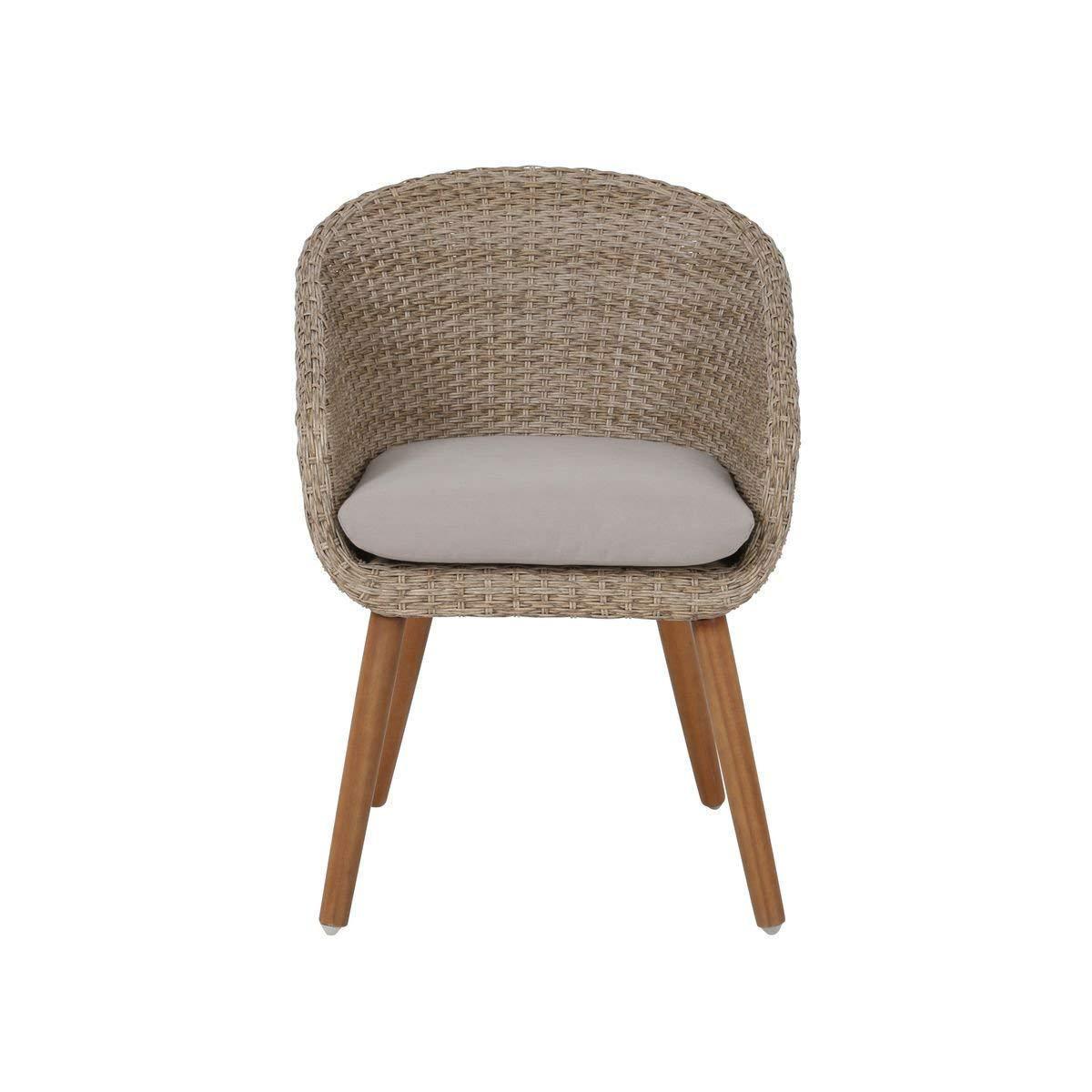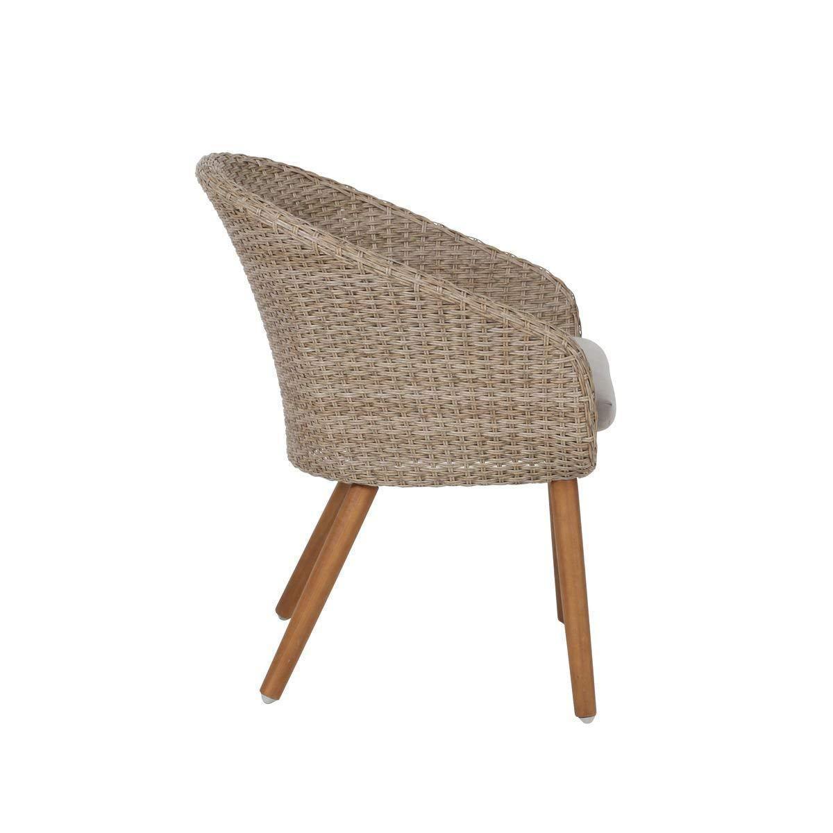 Кресло имеет прочный алюминиевый каркас,сиденье из полипропилена с текстурой поверхности под ротанг и деревянные ножки из акации. В комплекте предусмотрена подушка толщиной 5 см в цвет. Кресло станет прекрасным дополнением интерьера в доме или на террасе, замечательно смотрится как в составе обеденной группы, так и в лаундж-зоне.