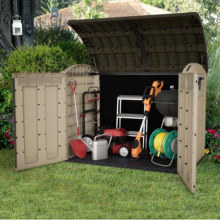 Вместительный чулан STORE-IT-OUT ULTRA является отличным решением для хранения всех видов оборудования, садовых принадлежностей и инструментов, а также различных предметов домашнего обихода. Идеально поместит рекреационное оборудование, такое как велосипеды и садовая мебель и т.д. Откидная крышка и двустворчатые двери обеспечивают легкий доступ к внутреннему пространству. Оптимальные размеры и горизонтальная конструкция чулана позволят расположить его в наиболее предпочтительном местоположении окружающей среды. Изготовлен из высококачественных материалов, эффективно защищает хранящиеся в нем предметы от неблагоприятных погодных условий, грязи и влаги.