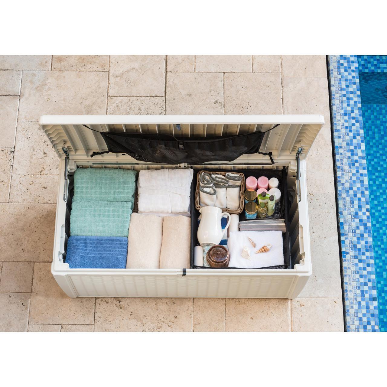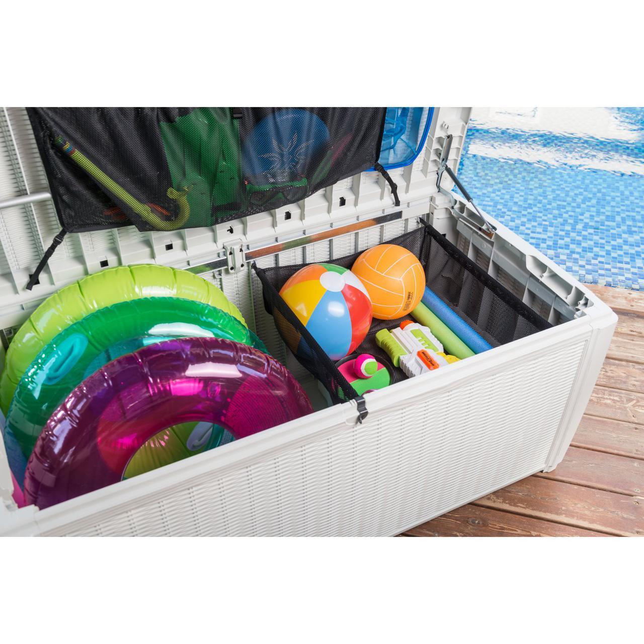 Сундук Sumatra вместит все необходимые садовые принадлежности, а также подушки и пледы, аксессуары для бассейна и прочее! Объем сундука 500л!  Идеальный способ хранения вещей в спортивной зоне, а также в зоне отдыха и бассейна. Текстура поверхности напоминает ротанговое переплетение, сундук выполнен из прочного полипропилена и надежно защищает предметы, хранящиеся в нем, от влаги, грязи и УФ-лучей. В крышке предусмотрен механизм , позволяющий легко ее открывать.  Поверхность сундука прочная и также может служить сиденьем для 2-х человек. Внутренняя часть крышки имеет сетчатый карман, который помогает сортировать вещи.