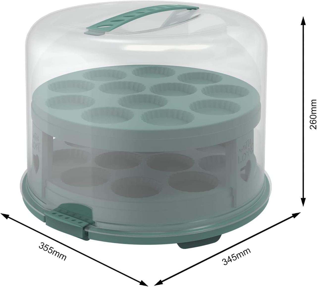 В комплекте: 1 нижний поддон, 2 вкладыша для кексов, 1 прозрачная крашка с 2-мя фиксаторами и 1 ручкой.