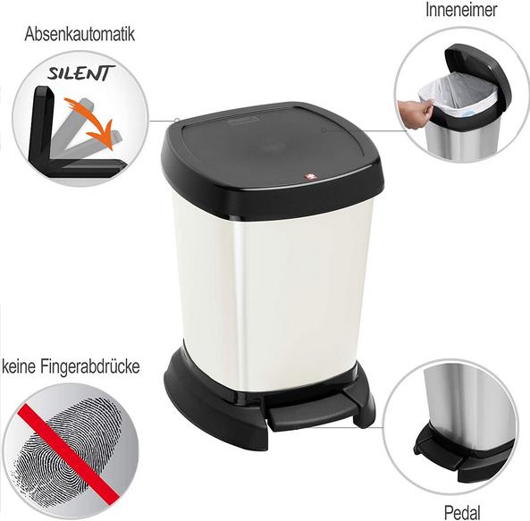 Ведро изготовлено из высококачественного пластика, легкое и прочное одновременно. Плотно закрывающаяся крышка бесшумно опускается и обеспечивает надежную защиту от выходящих запахов отходов. Устойчивые резиновые ножки также гарантируют нескользящую подставку на кафельном полу. С помощью отдельного внутреннего кольца использованные мешки для мусора остаются незаметными.