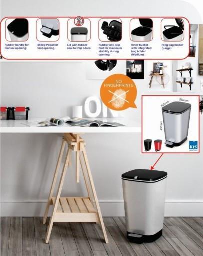 Контейнер для мусора объемом 45 литров с педалью, прочный, но простой и элегантный, подходит для любой комнаты в доме. Корзина очень устойчива благодаря резиновым ножкам, а наверху есть ручка для ручного открывания. Резиновая прокладка на крышке удерживает неприятные запахи внутри. Благодаря устойчивой к царапинам высококачественной отделке на корзине не остается отпечатков пальцев.