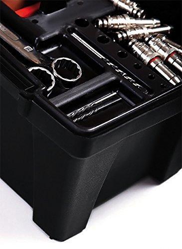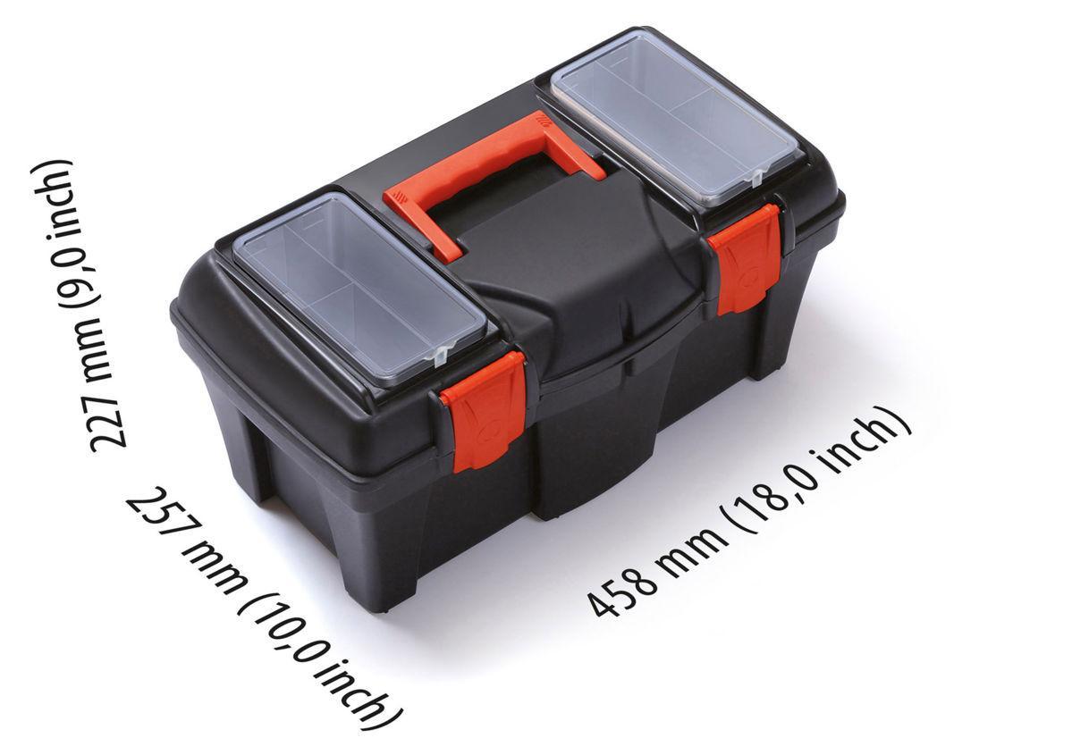 Ящик для инструментов оборудован  вынимаемым внутренним вкладышем и двумя независимыми отсеками. Независимые органайзеры имеют прозрачный верх для удобства складывания самых мелких деталей. Прочная ручка для переноски. Крышка прочно закрывается фиксаторами. Ящик выполнен из ударопрочного полипропилена.