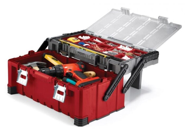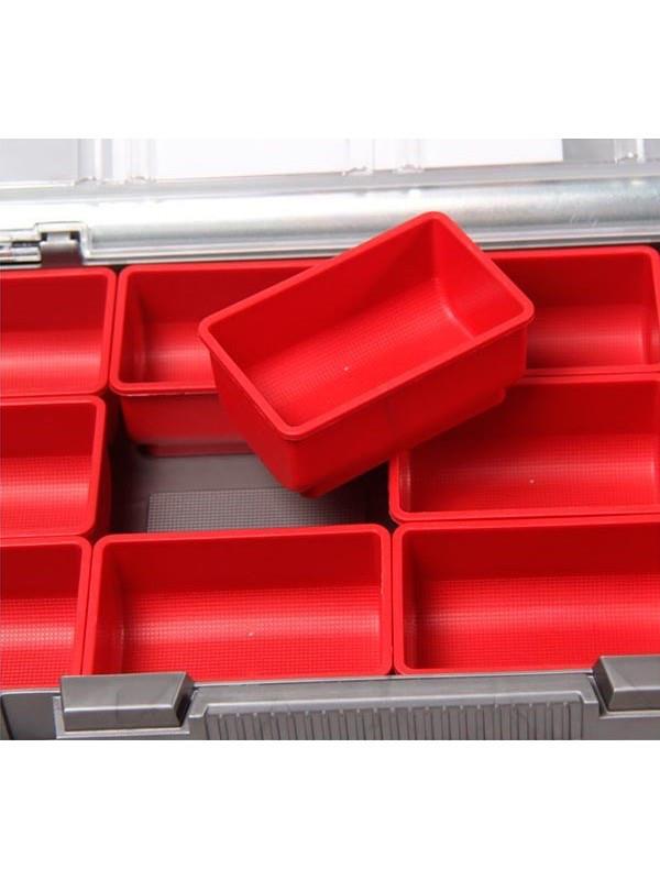 Практичный функциональный ящик для инструментов пригодится каждому мужчине. В ящике специально разработана система хранения помогает подразделить инструменты в зависимости от размера. Продолговатый отсек предназначен специально для длинных инструментов, внутренняя секция – для мелких болтиков, гаек и нужных мелочей. Ящик просто транспортировать при помощи удобной металлической ручки с накладками. Усиленный материал (плотный полипропилен) позволяет использовать ящик в трудных условиях труда, конструкция долговечная и надежно прослужит долгое время.