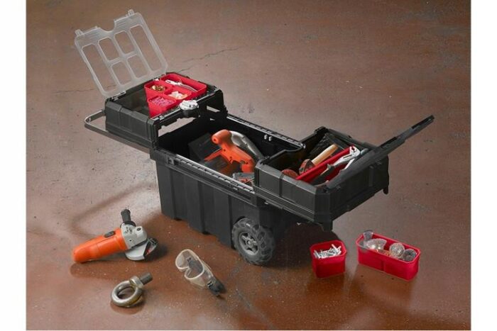 Большой мобильный ящик для инструментов позволяет упорядочить инструменты и легко перемещать, благодаря прочным колесам и удобной ручке.