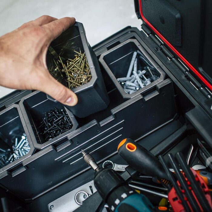 Ручки, застежки и коннектор для модульного соединения коробок друг с другом изготовлены из сверхпрочного пластика, которые обеспечивают максимальную прочность даже в самых тяжелых условиях эксплуатации.