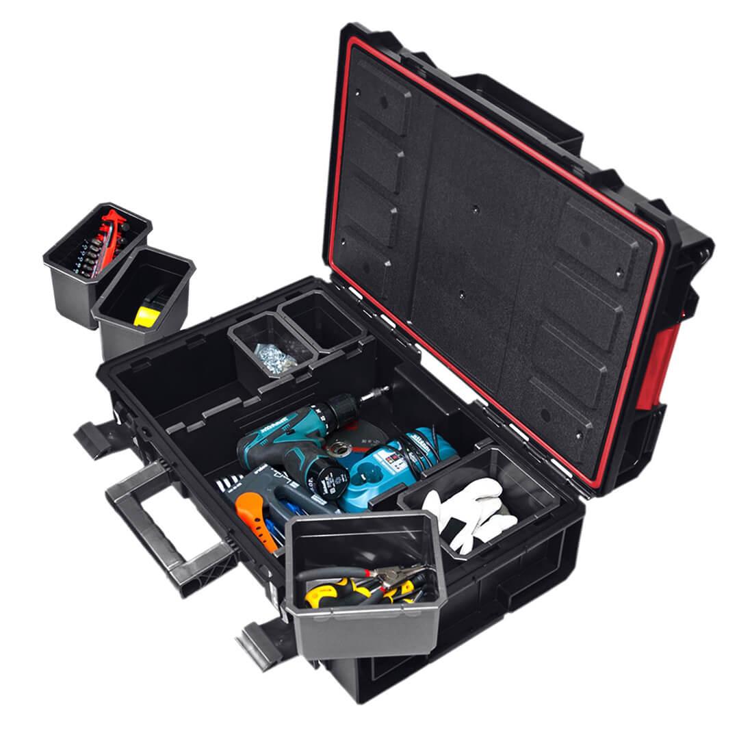Ручки, застежки и коннектор для модульного соединения коробок друг с другом изготовлены из сверхпрочного пластика, которые обеспечивают максимальную прочность даже в самых тяжелых условиях эксплуатации.