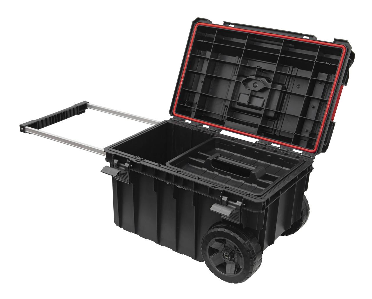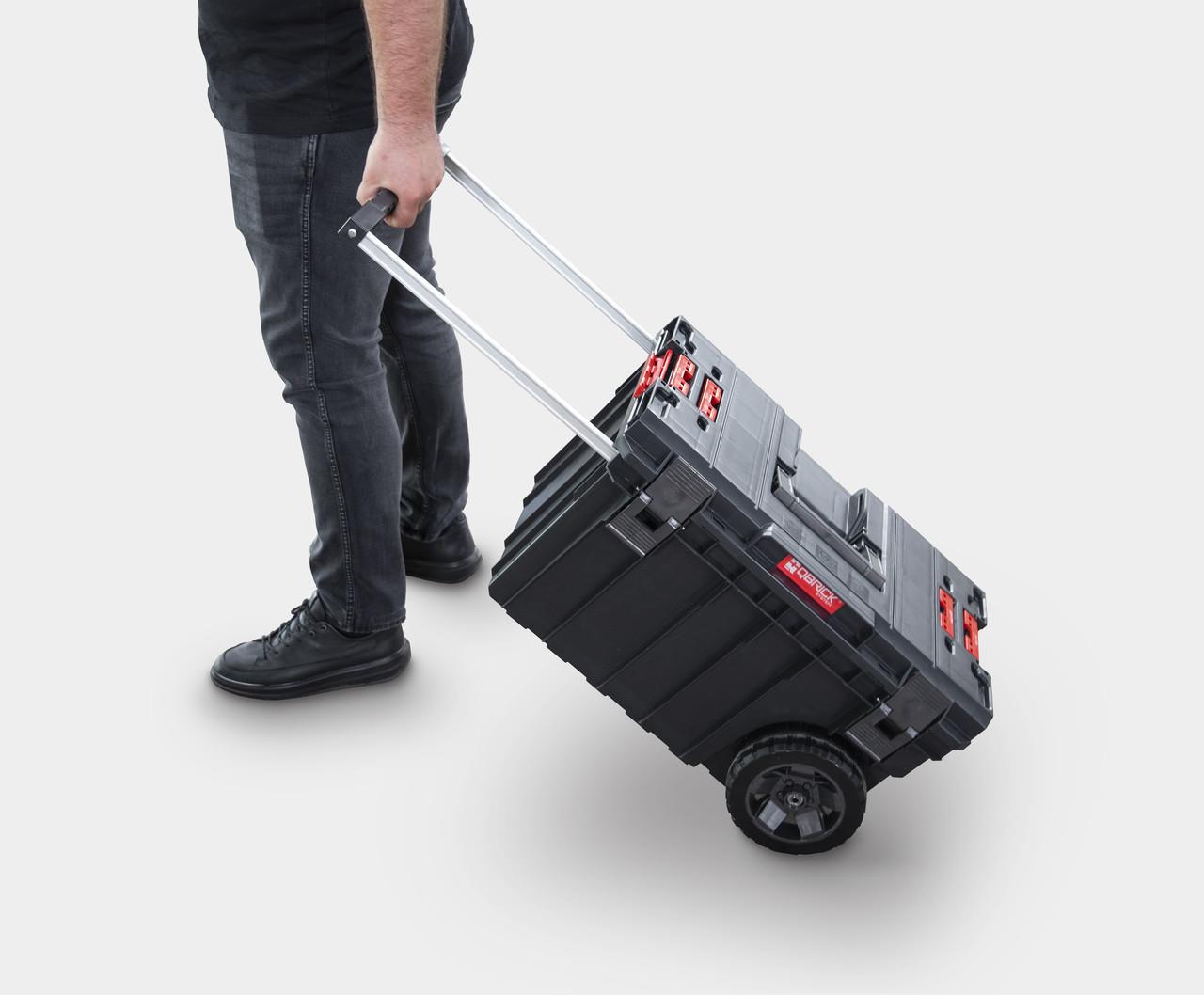 Большой ящик для инструментов на колесах для модульных систем Qbrick. Два опорных колеса, закрепленные на металлической оси, обеспечивают безопасную транспортировку наборов коробок и органайзеров.