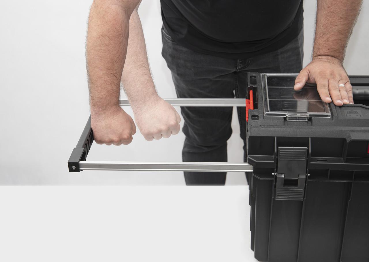 Телескопическая алюминиевая ручка, выдвигающаяся сбоку, обеспечивает удобный доступ внутрь бокса, а также позволяет удобно переносить бокс в соединении с другими элементами линейки ONE, скрепленными полиамидными соединителями.