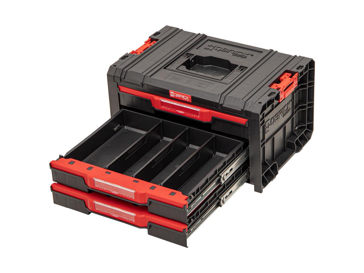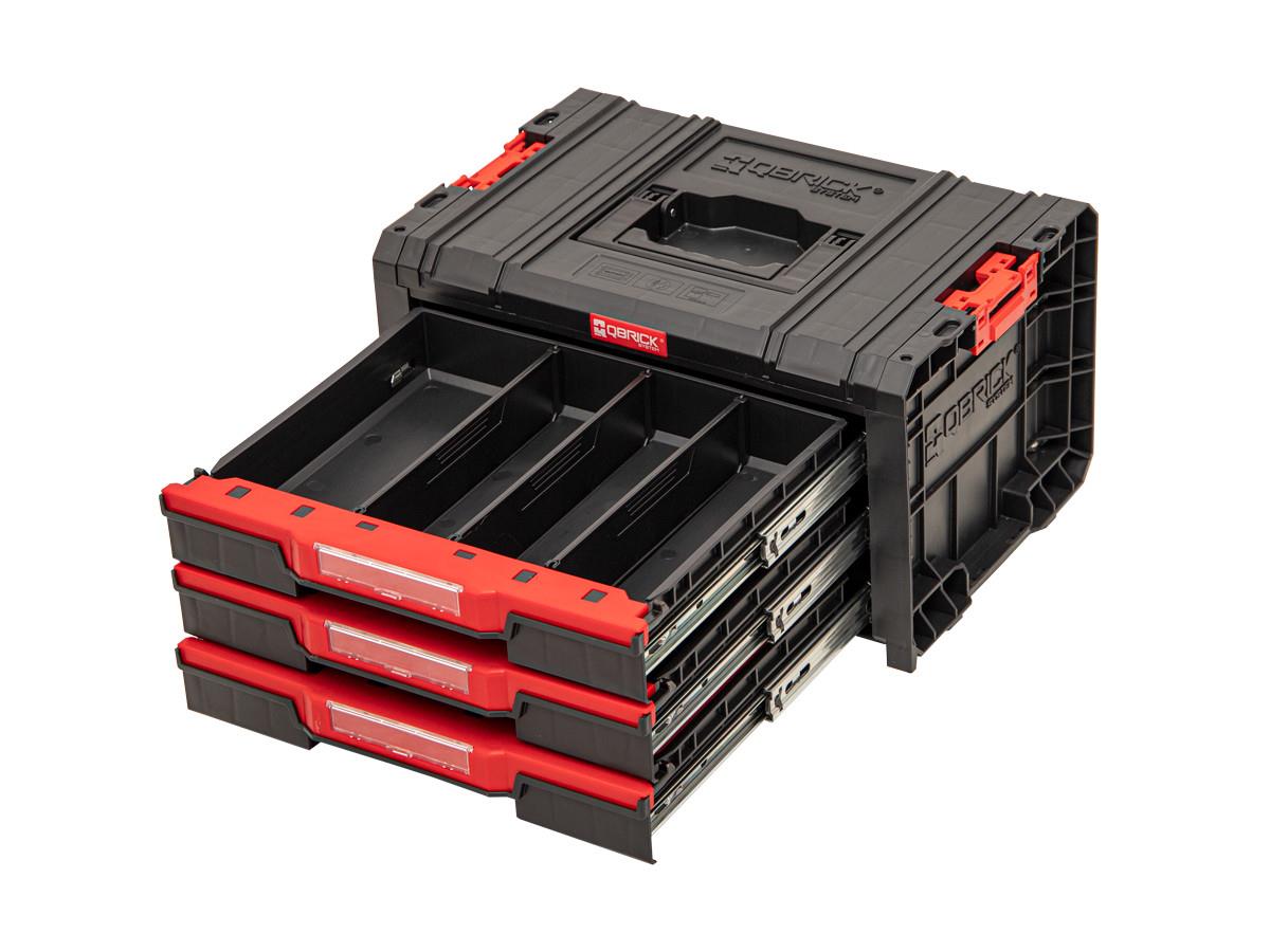 Qbrick System PRO Drawer 3 Toolbox Basic — вместительный модульный ящик для инструментов, оснащенный тремя выдвижными ящиками на металлических направляющих. Удобная кнопка обеспечивает легкий доступ к их содержимому. Базовая версия ящика оснащена 9 регулируемыми отсеками, которые позволяют организовать инструменты и принадлежности для мастерских.